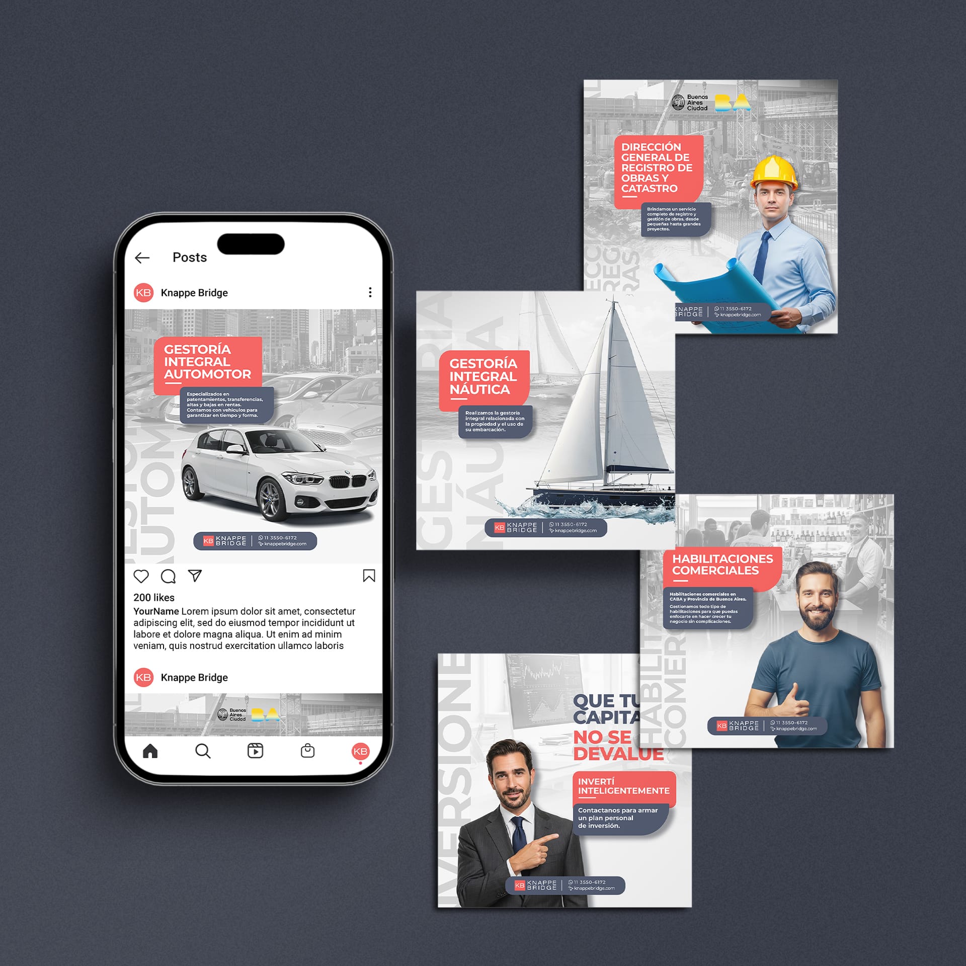 Diseño de posteos para Instagram para Knappe Bridge, manteniendo un estilo corporativo alineado con la identidad de la gestoría…